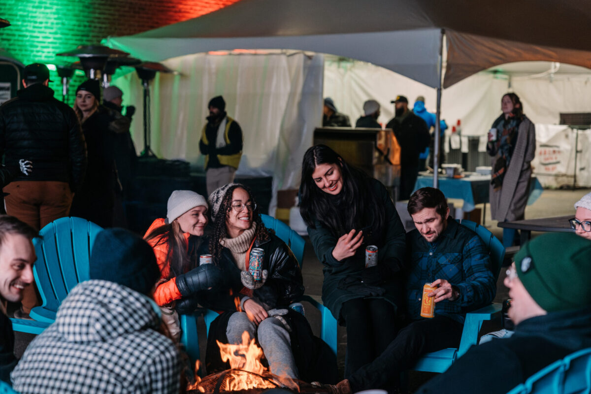Enjoy a free hot drink on a heated, pet-friendly patio with blankets, toques, DJ vibes, and pup treats.